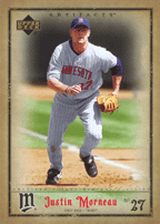 As soon as scouting reports circulated on Justin, he began to slump. Rather than concentrating on making contact, Justin tried to overpower the ball. He wasn’t staying back, and pitchers found holes in his long swing After hitting .226 over the next month, Justin was sent back to Triple-A Rochester and then to Double A. Not satisfied with his progress, he flew down to Puerto Rico after the season for winter ball. Heading into the 2004 campaign, the Twins were ready to contend, particularly with Cy Young-hopeful Johan Santana at the top of the rotation. Justin started the year with Rochester. When Mientkiewicz was sidelined with a sore wrist, Justin returned to the everyday lineup in Minnesota. Defensively, he wasn't there yet, but at the plate Justin looked confident. The Twins were convinced enough to deal Mientkiewicz to the Boston Red Sox. Justin gave Minnesota a much-needed big bat in the heart of the order. With Santana dominating on the hill, the Twins won the AL Central and met the New York Yankees in the playoffs. They were no match for the Bronx Bombers, bowing out in four games. Still, it was a great year for Justin, who hit .271 with 19 homers and 58 RBIs in less than half a season. The 2005 season began with high hopes for Justin. Injuries and Illness, however, derailed him early on. He showed up at spring training recovering from a cocktail of off-season ailments—appendicitis, chicken pox, pleurisy, and pneumonia. As Justin started to feel strong, he was hit in the head by Seattle’s Ron Villone, suffered a concussion and missed 13 games. Justin returned to the lineup at the end of April and sizzled through his first 10 games, posting a .439 batting average with 10 RBIs. May, unfortunately, was not as kind and his performance sagged. In June, he hurt his left elbow and received a cortisone shot for a bone spur. Struggling to regain his health, Justin was dropped as low as eighth in the order. When his average sank to .251 in July, the Twins weighed sending him back to the minors. Part of Justin's slump stemmed back to his April beaning. But he was also having trouble laying off inside pitches, failed to use the opposite field and chased one breaking ball after another. He couldn’t touch left either, hitting .201 in 154 at-bats against southpaws. Justin's rough season ended on a low note went he got in a tussle with Torii Hunter following a loss to the Kansas City Royal. While he downplayed the situation, it was emblematic of the frustration of a lost season. Indeed, the Twins missed the playoffs for the first time since 2001. |
